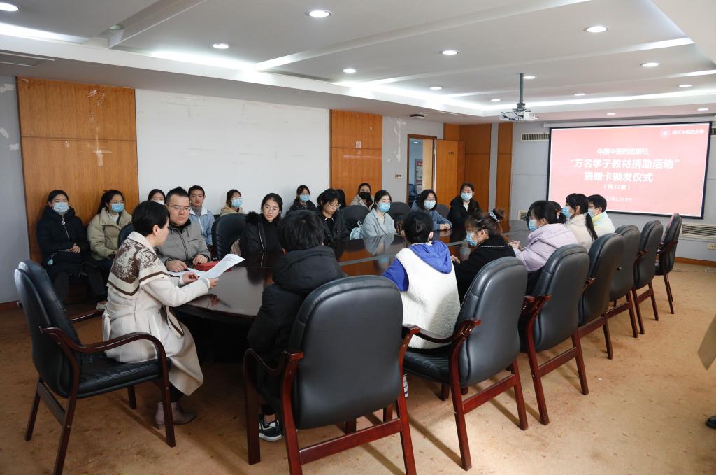 2021年12月8日中午,教务处举行了中国中医药出版社第22期“万名学子教材捐助活动”捐赠卡颁发仪式。教务处处长刘英超,教学科科长、科员,及受捐赠的学生参加了此次活动。