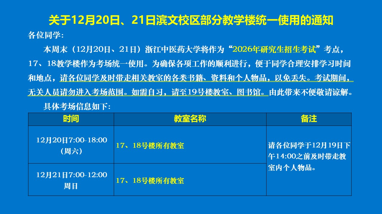 关于12月20日、21日滨文校区17号、18号教学楼统一使用的通知
